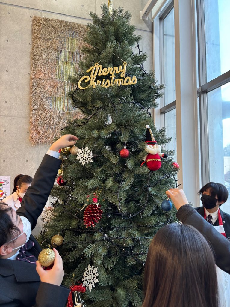 クリスマスツリーを立てたり、高いところで電球のコードを巻き付けたりするのは教職員が行いましたが、そこから先のオーナメントの飾りつけは1年生各クラスの行事委員が手伝ってくれて、とても